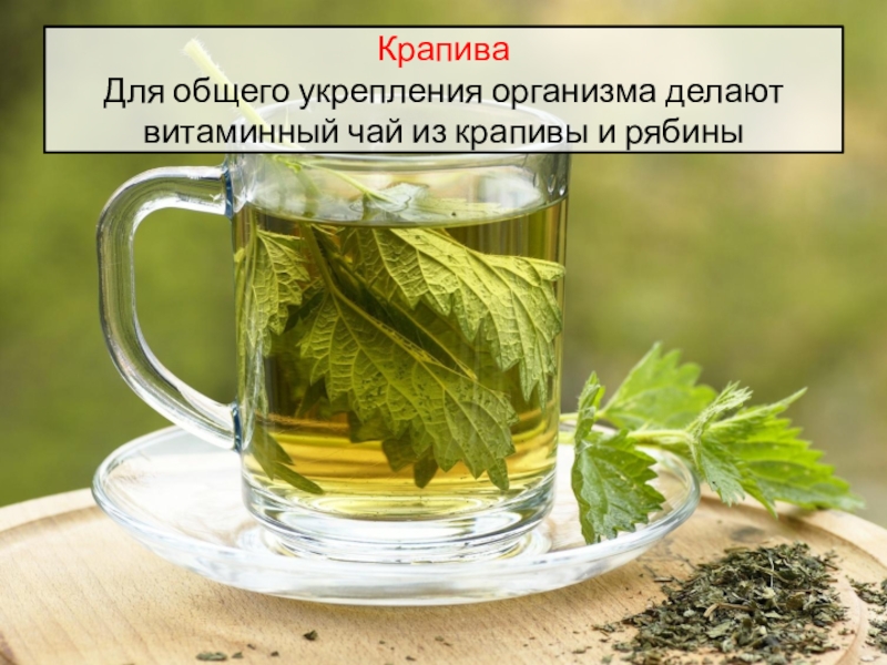 Слайд 10Крапива Для общего укрепления организма делают витаминный чай из крапивы и рябины