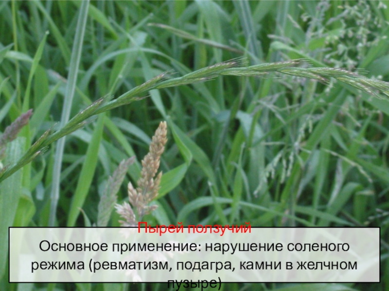 Слайд 14Пырей ползучий Основное применение: нарушение соленого режима (ревматизм, подагра, камни в желчном