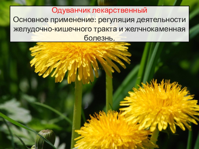 Одуванчик лекарственный Основное применение: регуляция деятельности желудочно-кишечного тракта и желчнокаменная болезнь.