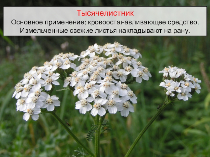 Слайд 15Тысячелистник Основное применение: кровоостанавливающее средство. Измельченные свежие листья накладывают на рану.