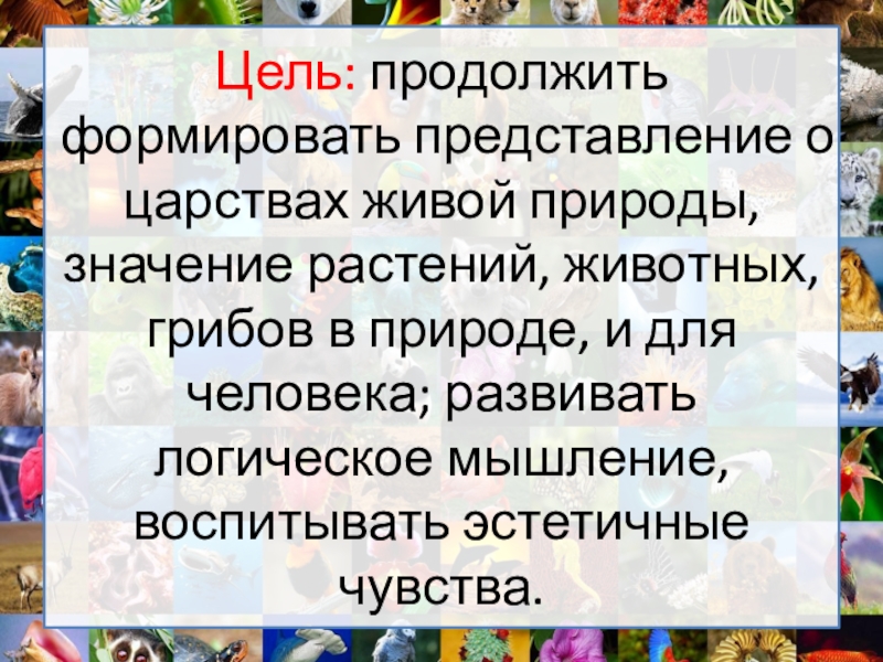 Цель: продолжить формировать представление о царствах живой природы, значение растений, животных, грибов в природе, и для человека; развивать логическое мышление, воспитывать эстетичные чувства.