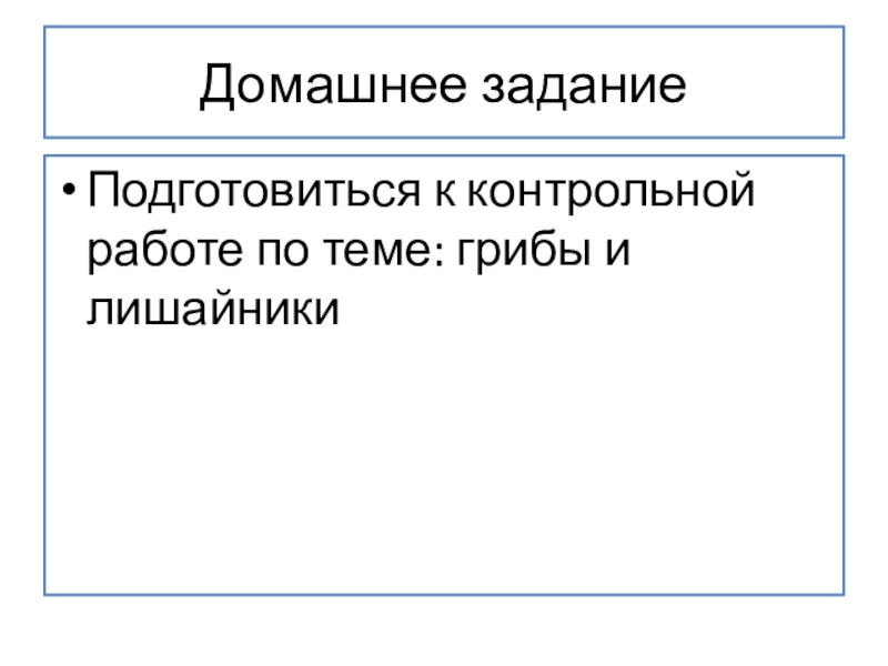 Домашнее задание Подготовиться к контрольной работе по теме: грибы и лишайники