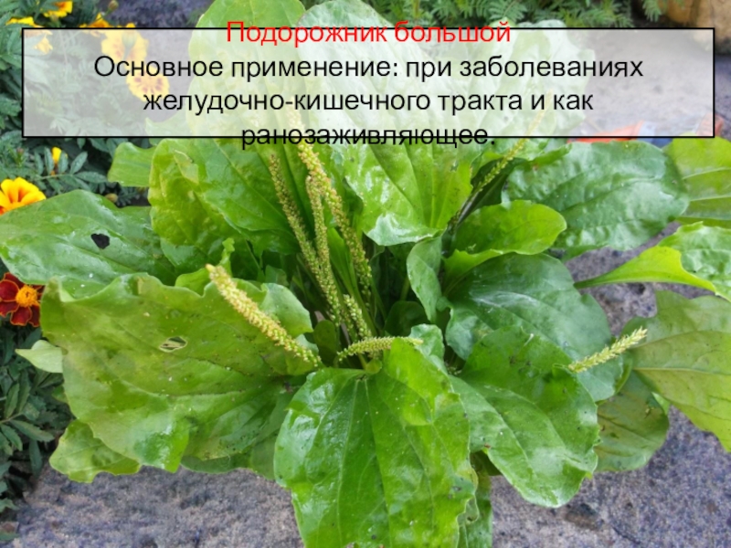 Слайд 13Подорожник большой Основное применение: при заболеваниях желудочно-кишечного тракта и как ранозаживляющее.