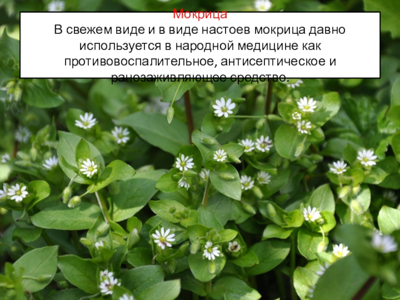 Слайд 8Мокрица В свежем виде и в виде настоев мокрица давно используется в