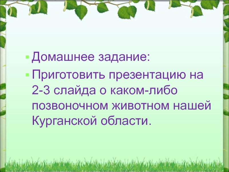 Домашнее задание:Приготовить презентацию на 2-3 слайда о каком-либо позвоночном животном нашей Курганской области.