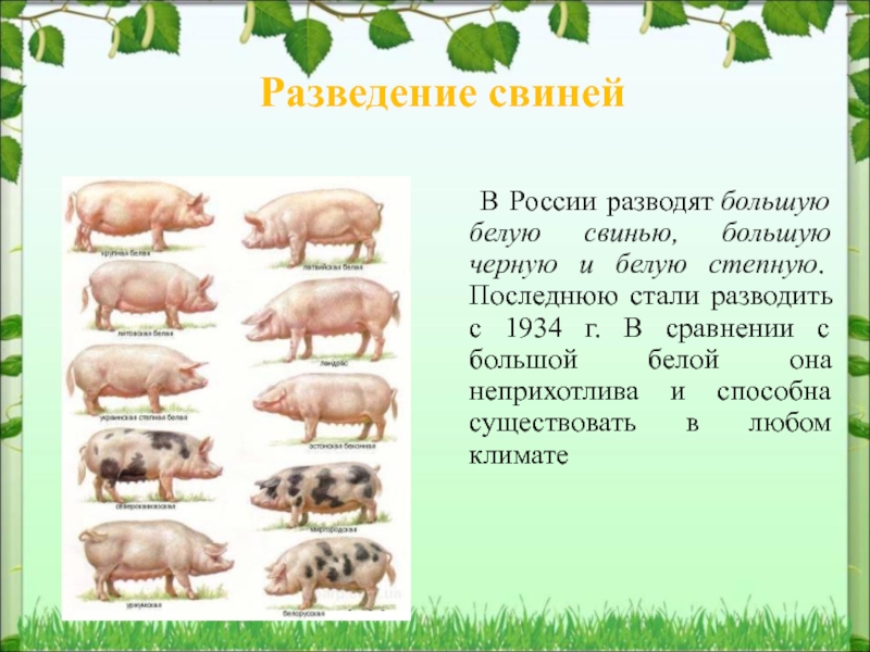 Разведение свиней	В России разводят большую белую свинью, большую черную и белую степную. Последнюю стали разводить с 1934 г.