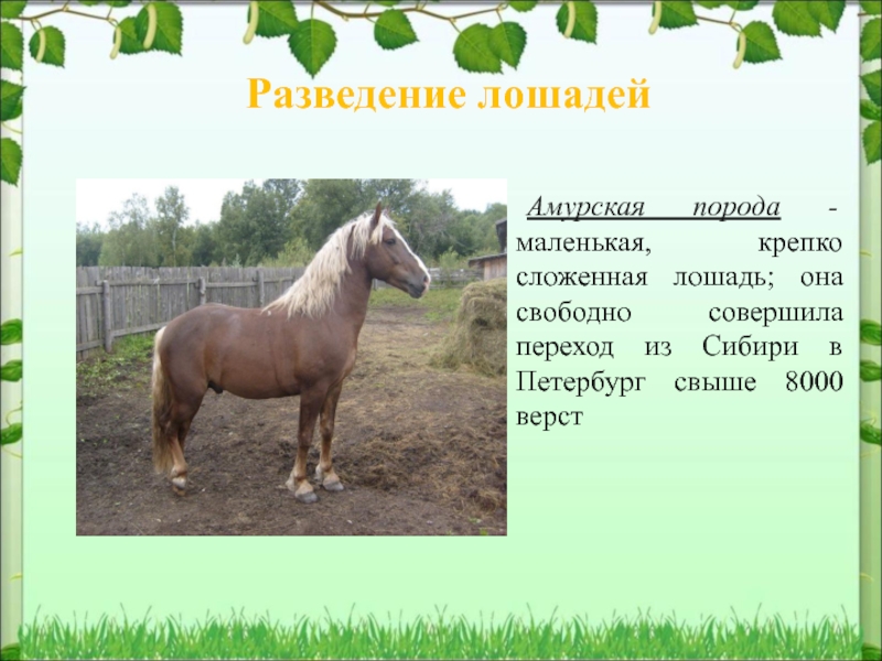 Разведение лошадей	Амурская порода - маленькая, крепко сложенная лошадь; она свободно совершила переход из Сибири в Петербург свыше