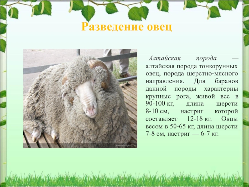 Разведение овец 	Алтайская порода — алтайская порода тонкорунных овец, порода шерстно-мясного направления. Для баранов данной породы характерны