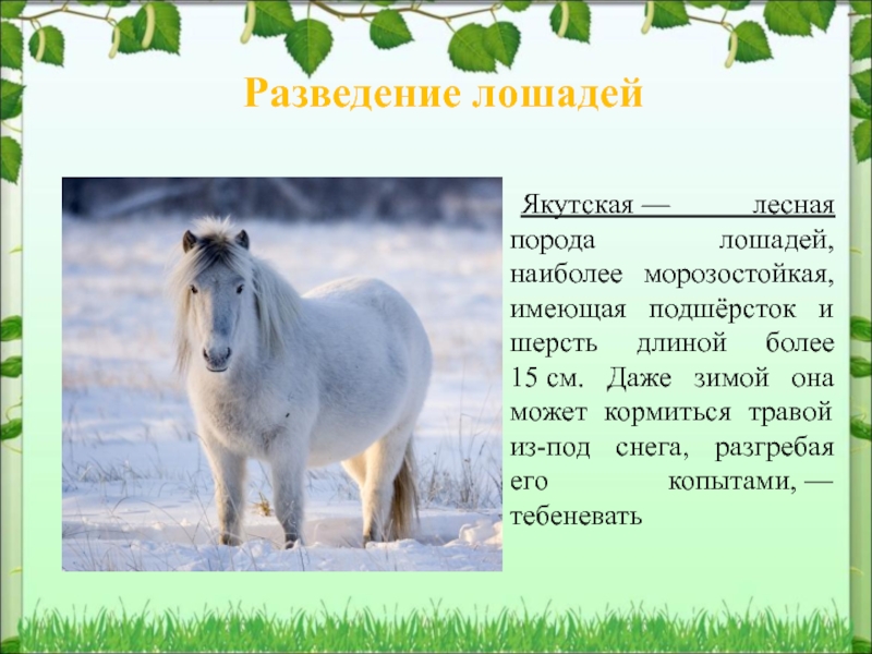Разведение лошадей	Якутская — лесная порода лошадей, наиболее морозостойкая, имеющая подшёрсток и шерсть длиной более 15 см. Даже зимой она