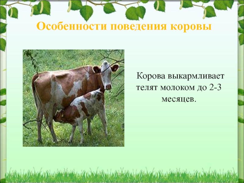 Особенности поведения коровы	Корова выкармливает телят молоком до 2-3 месяцев.