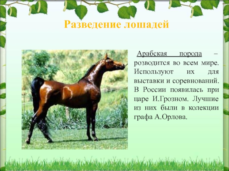 Разведение лошадей	Арабская порода – розводится во всем мире. Используют их для выставки и соревнований. В России появилась