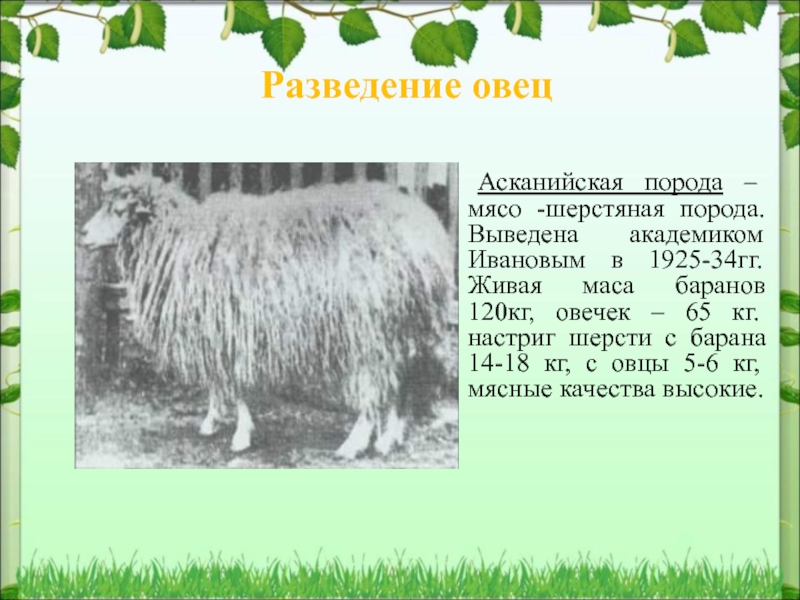 Разведение овец	Асканийская порода – мясо -шерстяная порода. Выведена академиком Ивановым в 1925-34гг. Живая маса баранов 120кг, овечек