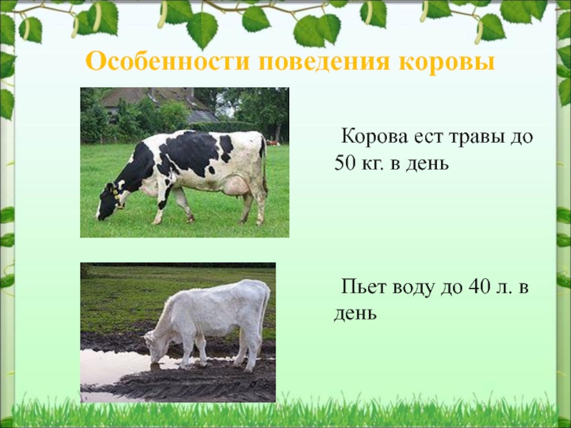 Особенности поведения коровы	Корова ест травы до 50 кг. в день	Пьет воду до 40 л. в день