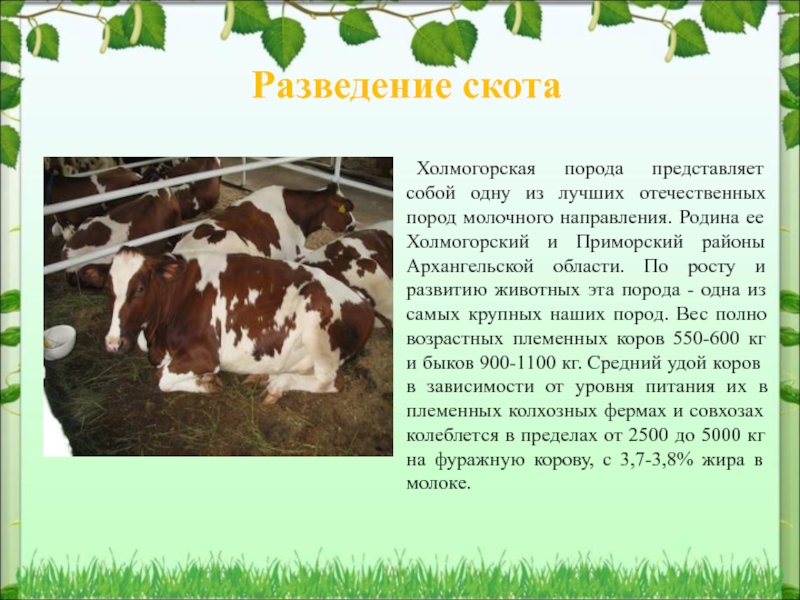 Разведение скота	Холмогорская порода представляет собой одну из лучших отечественных пород молочного направления. Родина ее Холмогорский и Приморский