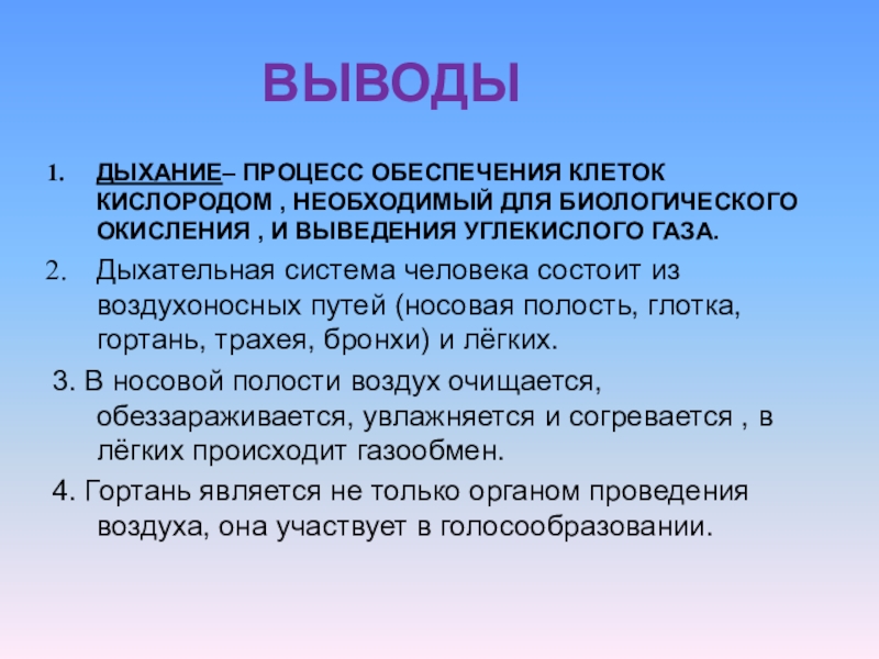 ДЫХАНИЕ– ПРОЦЕСС ОБЕСПЕЧЕНИЯ КЛЕТОК КИСЛОРОДОМ , НЕОБХОДИМЫЙ ДЛЯ БИОЛОГИЧЕСКОГО ОКИСЛЕНИЯ , И ВЫВЕДЕНИЯ УГЛЕКИСЛОГО ГАЗА.