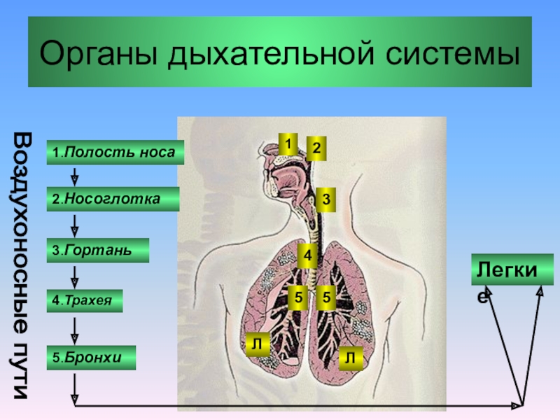 Дыхательная система человека состоит из воздухоносных путей (носовая полость, глотка, гортань, трахея, бронхи) и лёгких.