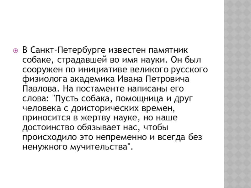 В Санкт-Петербурге известен памятник собаке, страдавшей во имя науки. Он был