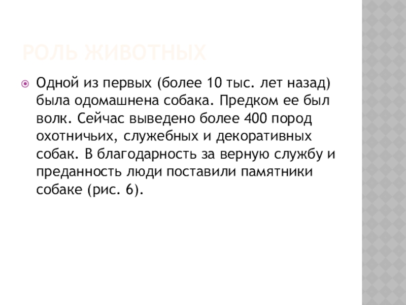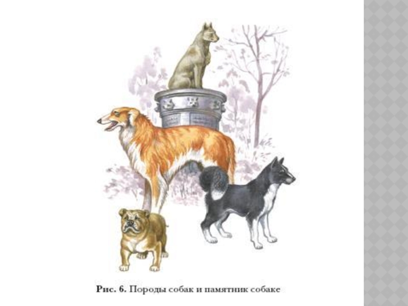 собака. Предком ее был волк. Сейчас выведено более 400 пород охотничьих, служебных и декоративных собак. В благодарность за верную службу и преданность люди поставили памятники собаке (рис. 6).