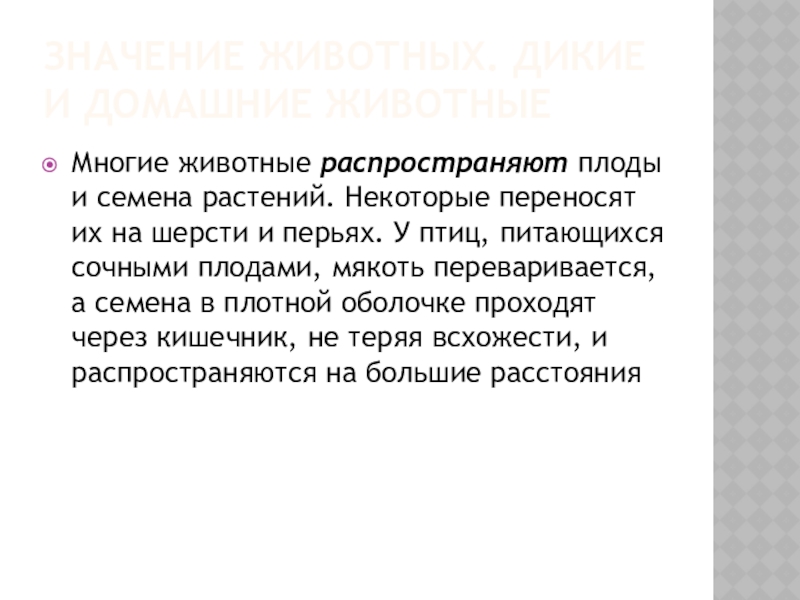 растений. Некоторые переносят их на шерсти и перьях. У птиц, питающихся сочными плодами, мякоть переваривается, а семена в плотной оболочке проходят через кишечник, не теряя всхожести, и распространяются на большие расстояния