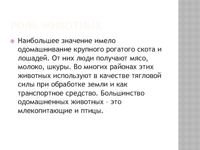 них люди получают мясо, молоко, шкуры. Во многих районах этих животных используют в качестве тягловой силы при обработке земли и как транспортное средство. Большинство одомашненных животных – это млекопитающие и птицы.