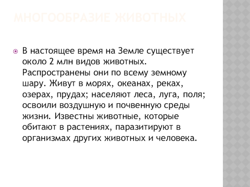 животных. Распространены они по всему земному шару. Живут в морях, океанах, реках, озерах, прудах; населяют леса, луга, поля; освоили воздушную и почвенную среды жизни. Известны животные, которые обитают в растениях, паразитируют в организмах других животных и человека.