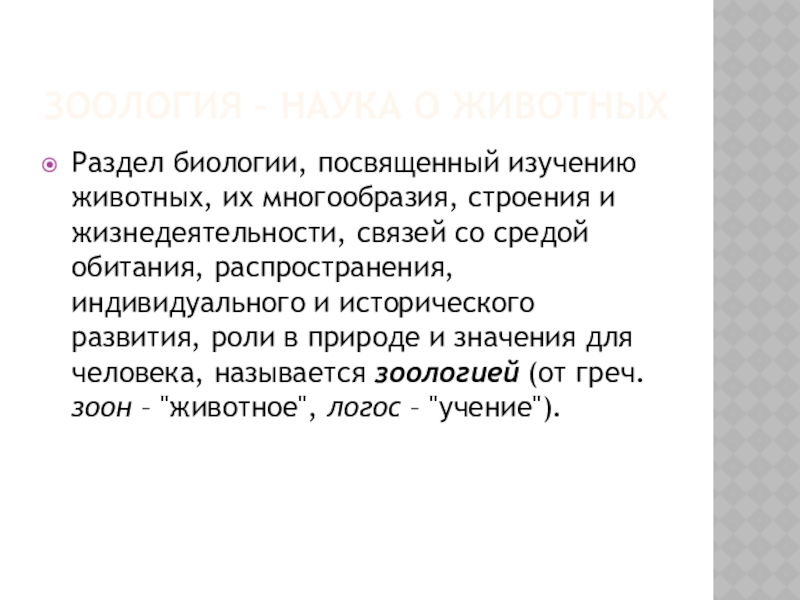 и жизнедеятельности, связей со средой обитания, распространения, индивидуального и исторического развития, роли в природе и значения для человека, называется зоологией (от греч. зоон – "животное", логос – "учение").