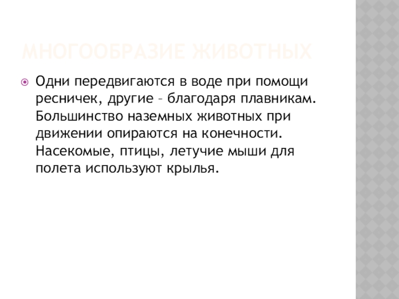 Большинство наземных животных при движении опираются на конечности. Насекомые, птицы, летучие мыши для полета используют крылья.