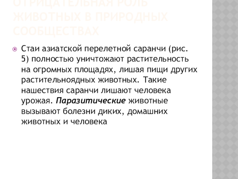 полностью уничтожают растительность на огромных площадях, лишая пищи других растительноядных животных. Такие нашествия саранчи лишают человека урожая. Паразитические животные вызывают болезни диких, домашних животных и человека