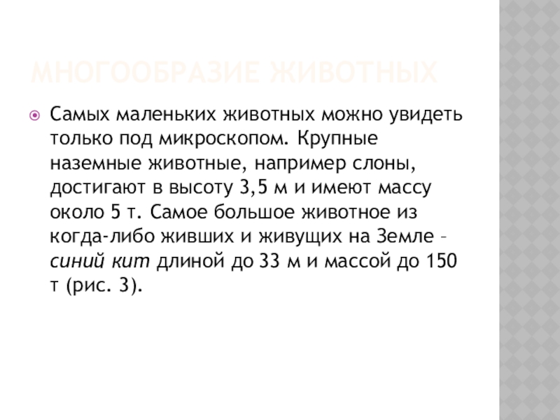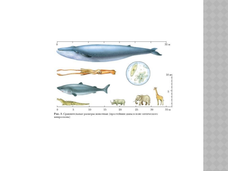 животные, например слоны, достигают в высоту 3,5 м и имеют массу около 5 т. Самое большое животное из когда-либо живших и живущих на Земле – синий кит длиной до 33 м и массой до 150 т (рис. 3).