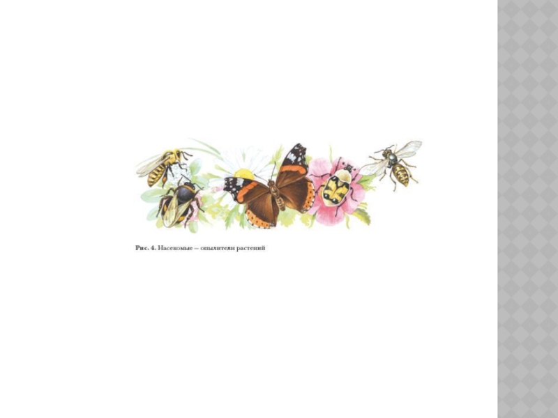 облику, строению, образу жизни, но и по той роли, которую они играют в природных сообществах. Велика роль в природе животных – опылителей растений (рис. 4). Это бабочки, жуки, мухи, шмели, пчелы и др. Без них облик наших лесов, лугов, полей был бы совсем другим.