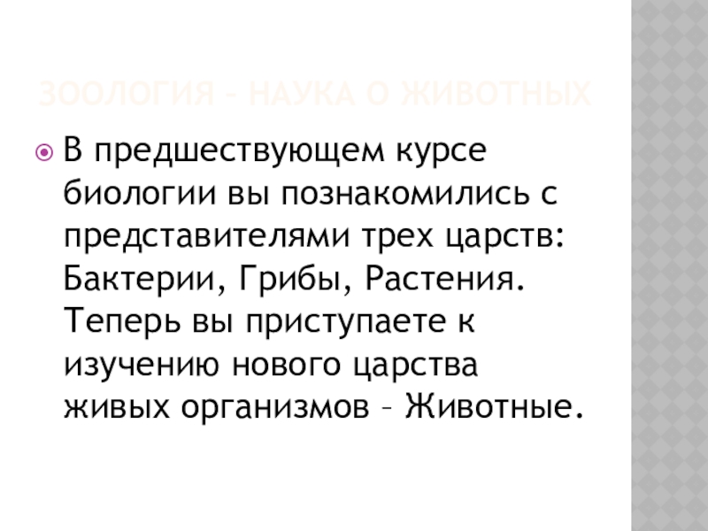 трех царств: Бактерии, Грибы, Растения. Теперь вы приступаете к изучению нового царства живых организмов – Животные.