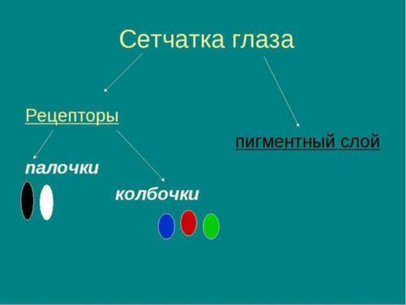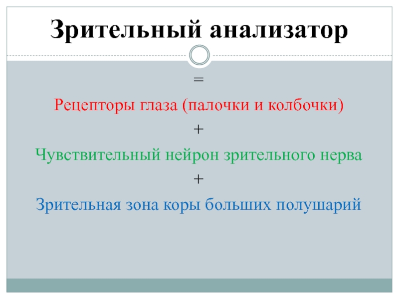 Зрительный анализатор=Рецепторы глаза (палочки и колбочки)+ Чувствительный нейрон зрительного нерва+Зрительная зона коры больших полушарий