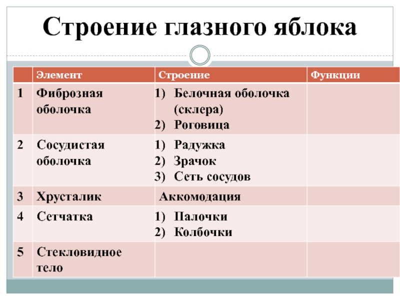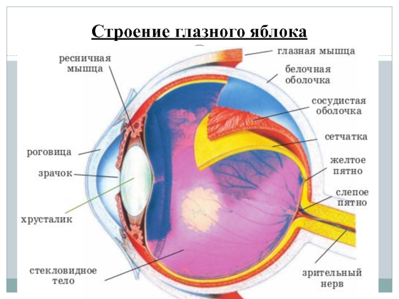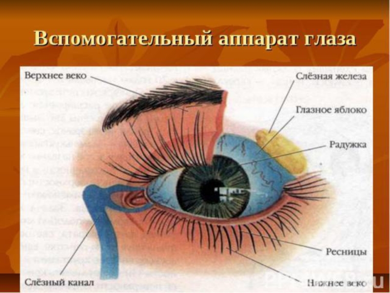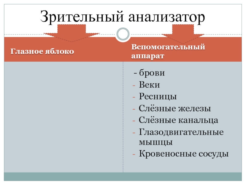 Глазное яблокоВспомогательный аппарат - бровиВекиРесницыСлёзные железыСлёзные канальцаГлазодвигательные мышцыКровеносные сосудыЗрительный анализатор