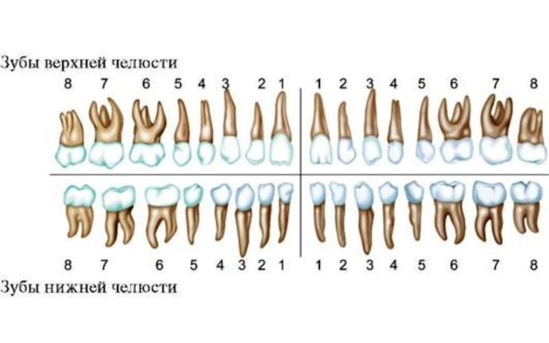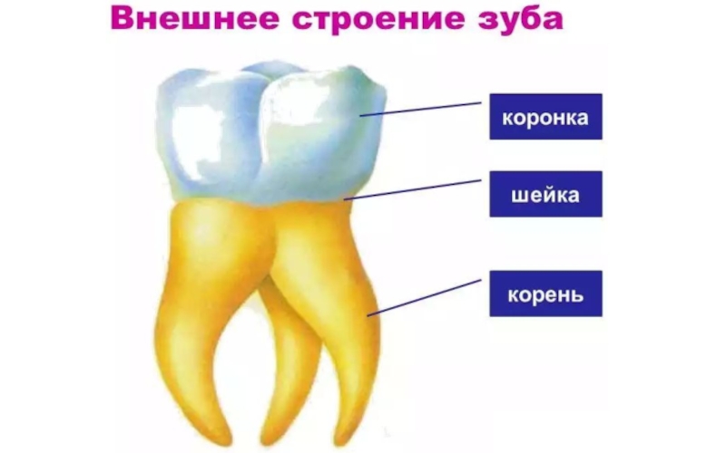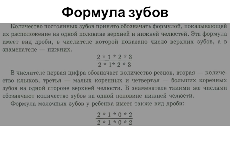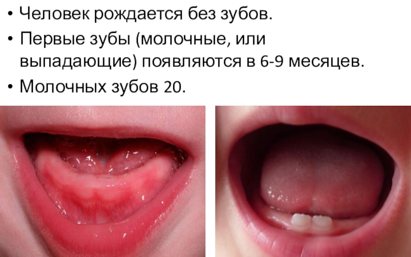 Человек рождается без зубов.Первые зубы (молочные, или выпадающие) появляются в 6-9 месяцев.Молочных зубов 20.