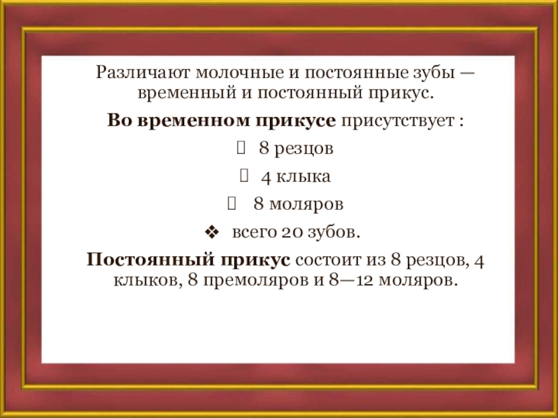 Слайд 7Различают молочные и постоянные зубы — временный и постоянный прикус.