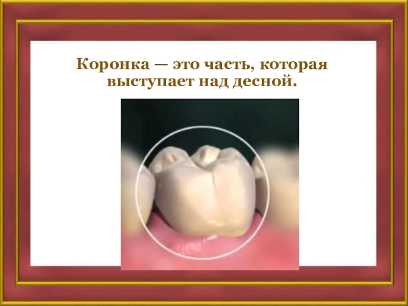 Слайд 12Коронка — это часть, которая выступает над десной.