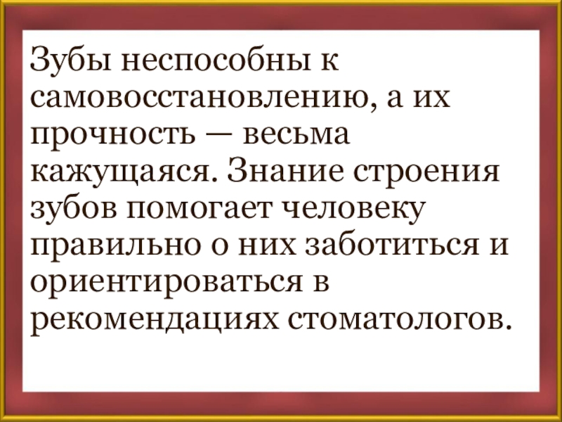 Слайд 3Зубы неспособны к самовосстановлению, а их прочность — весьма кажущаяся. Знание