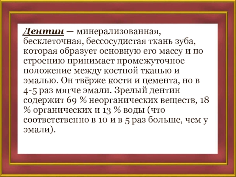 Слайд 19Дентин — минерализованная, бесклеточная, бессосудистая ткань зуба, которая образует основную его