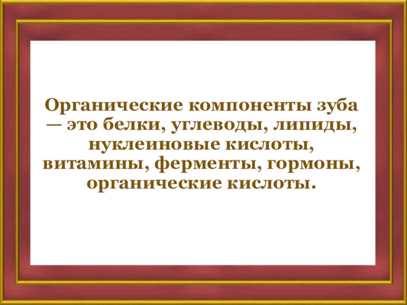 Слайд 17Органические компоненты зуба — это белки, углеводы, липиды, нуклеиновые кислоты, витамины,