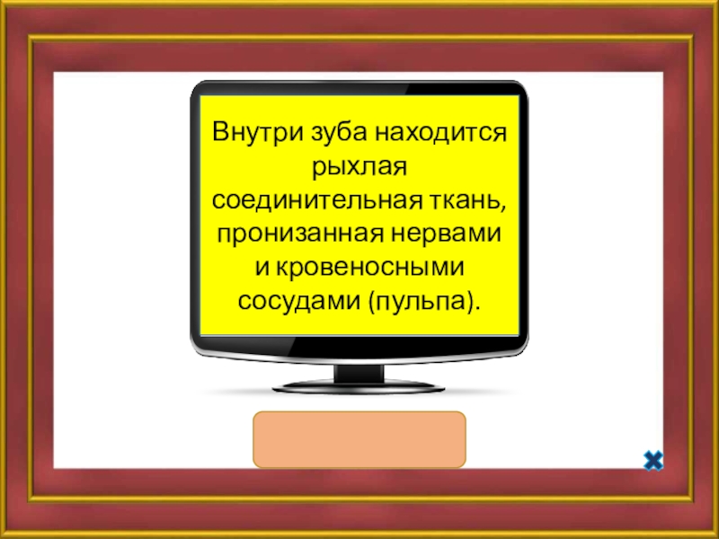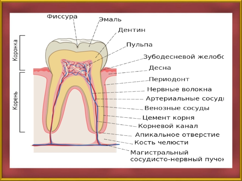 Слайд 6Внутри зуба находится рыхлая соединительная ткань, пронизанная нервами и кровеносными сосудами