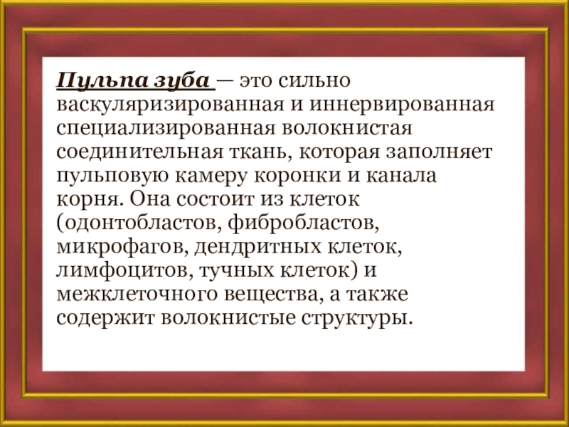 ткань, которая заполняет пульповую камеру коронки и канала корня. Она состоит из клеток (одонтобластов, фибробластов, микрофагов, дендритных клеток, лимфоцитов, тучных клеток) и межклеточного вещества, а также содержит волокнистые структуры.