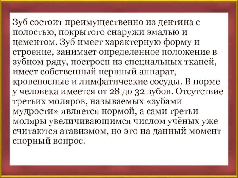 цементом. Зуб имеет характерную форму и строение, занимает определенное положение в зубном ряду, построен из специальных тканей, имеет собственный нервный аппарат, кровеносные и лимфатические сосуды. В норме у человека имеется от 28 до 32 зубов. Отсутствие третьих моляров, называемых «зубами мудрости» является нормой, а сами третьи моляры увеличивающимся числом учёных уже считаются атавизмом, но это на данный момент спорный вопрос.