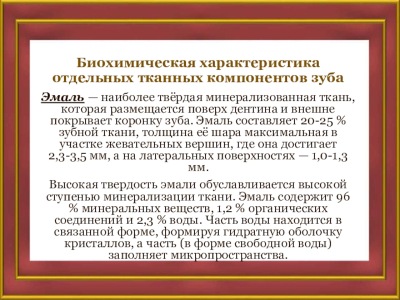 Слайд 18Биохимическая характеристика отдельных тканных компонентов зуба