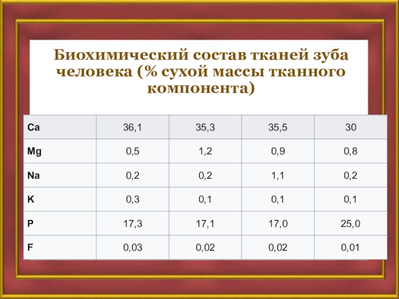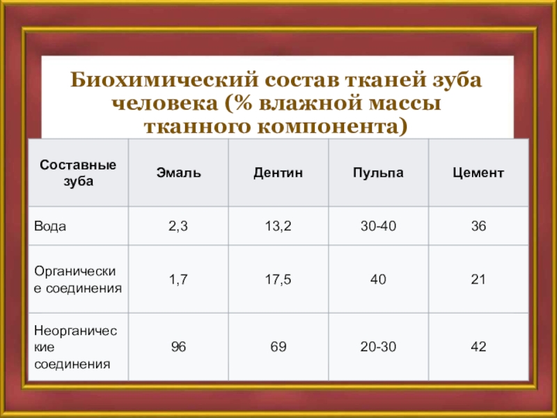 Слайд 16Биохимический состав тканей зуба человека (% сухой массы тканного компонента)
