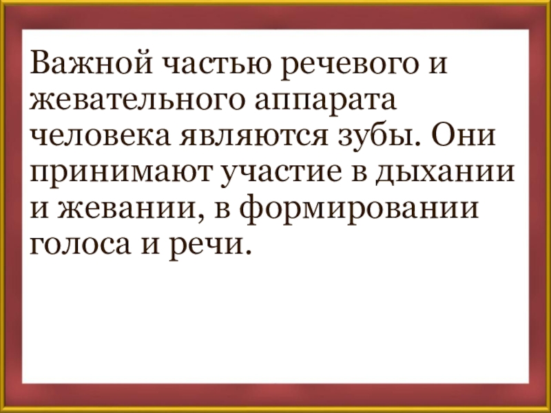 Слайд 2Важной частью речевого и жевательного аппарата человека являются зубы. Они принимают