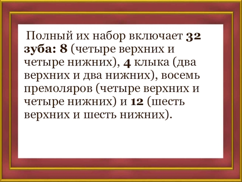 Слайд 9 Полный их набор включает 32 зуба: 8 (четыре верхних и