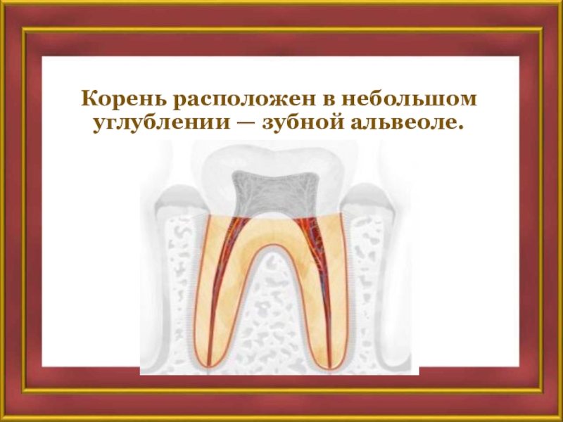 Слайд 14Корень расположен в небольшом углублении — зубной альвеоле.