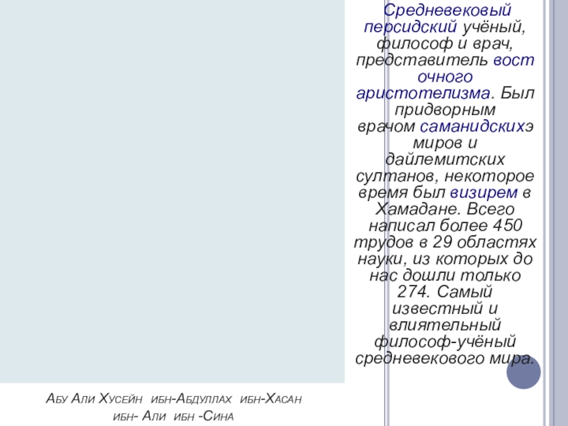 Средневековый персидский учёный, философ и врач, представитель восточного аристотелизма. Был придворным врачом саманидскихэмиров и дайлемитских султанов, некоторое время был визирем в Хамадане. Всего написал более 450 трудов в 29 областях науки, из которых до нас дошли только 274. Самый известный и влиятельный философ-учёный средневекового мира.
