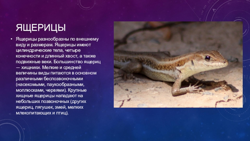 четыре конечности и длинный хвост, а также подвижные веки. Большинство ящериц — хищники. Мелкие и средней величины виды питаются в основном различными беспозвоночными (насекомыми, паукообразными, моллюсками, червями). Крупные хищные ящерицы нападают на небольших позвоночных (других ящериц, лягушек, змей, мелких млекопитающих и птиц).