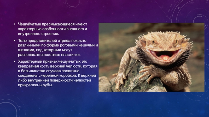 Слайд 3Чешуйчатые пресмыкающиеся имеют характерные особенности внешнего и внутреннего строения.